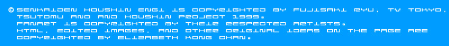 Note: (1) No mp3s. If you wanna host my page so that I can, e-mail me. (2) Don't write in the guestbook or e-mail me about whose pictures you want to see more of because I have pretty limited resources right now. I don't have an infinite amount of cash. With the help of Senkai Taisen though, there WILL be more pictures available for the characters there.